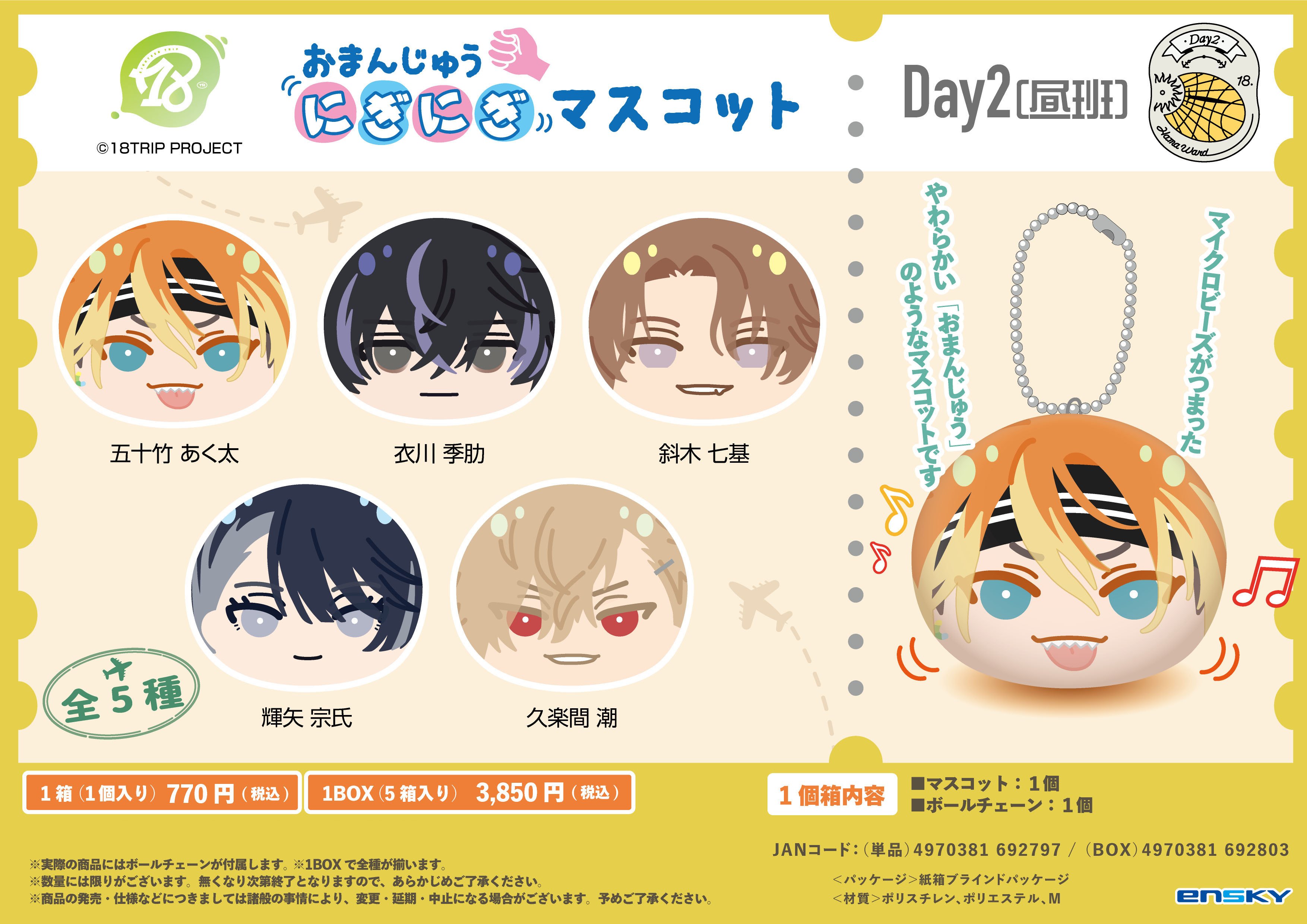 | 商品の特徴 | 18TRIP_おまんじゅうにぎにぎマスコット Day2(昼班)【コンプリートBOX。18TRIP おまんじゅうにぎにぎマスコット L4mps(夜班)【1BOX 5箱入り。叢雲 添|R1ze|【公式】18TRIP(エイトリ)。素人管理のため神経質な方の購入はお控えください。JOCHUM もこ マスコット。受け取り後24時間以内に評価つけられない方の購入不可 | ||