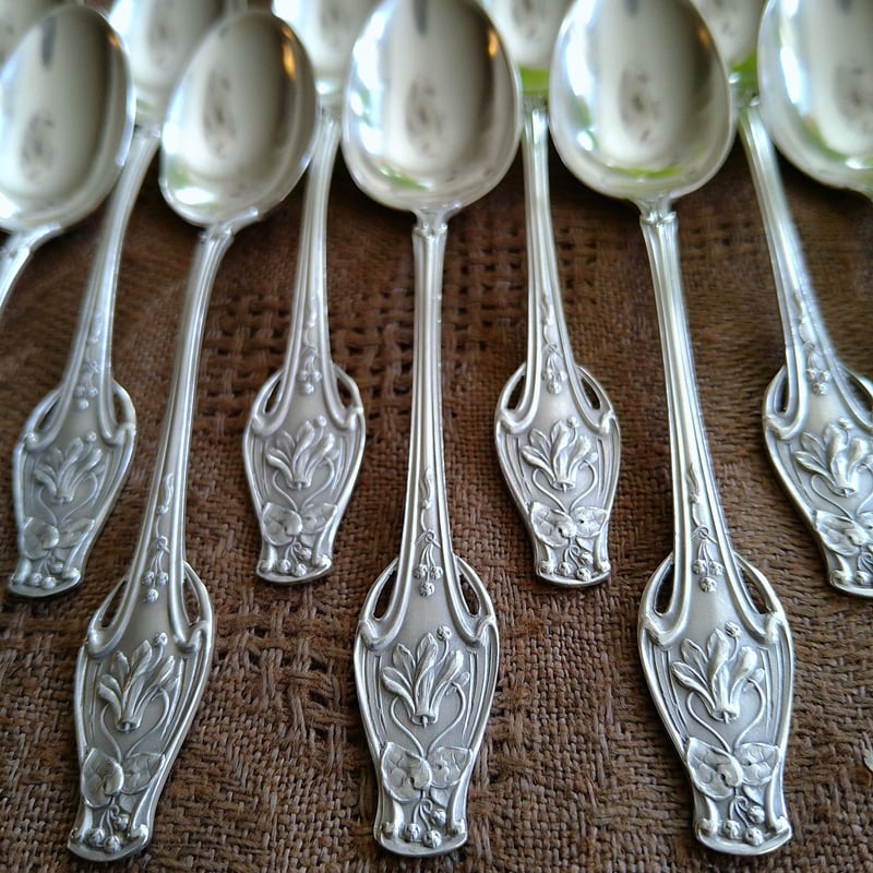 - 美術品・アンティーク・コレクション > 工芸品 > フランス アールヌーボー期 純銀無垢 スプーン&フォークセット ⑥ 小傷あり 1884~1910年HenriSoufflotフランス・パリ、シクラメンのアール