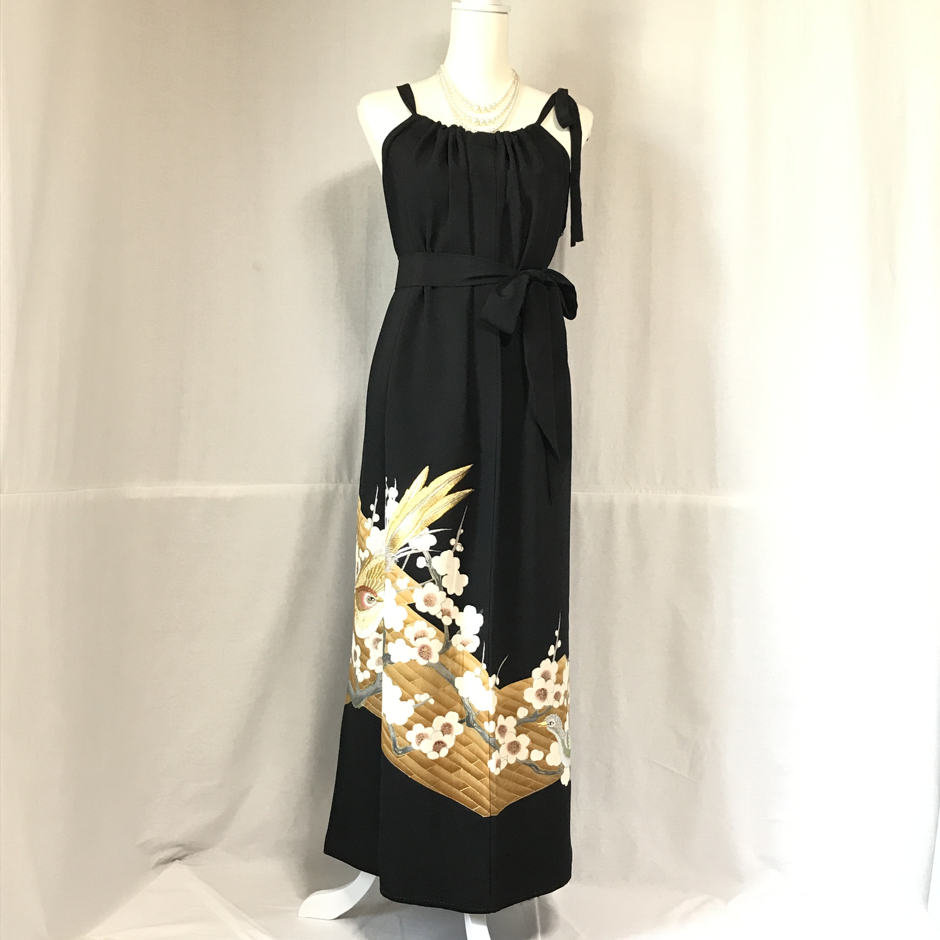 | メーカー | 着物リメイク フレンチ ワンピース 黒留袖 ロング Aライン ドレス 舞蝶紐文 着物リメイク |