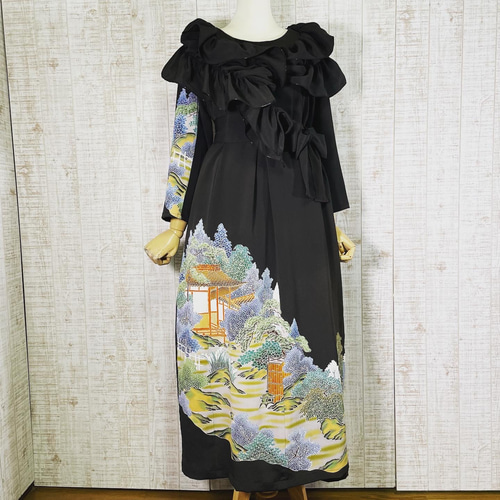 | メーカー | 272 手染め大輔 着物リメイク 黒縮緬 型染め ワンピース L〜フリーサイズ 231 |