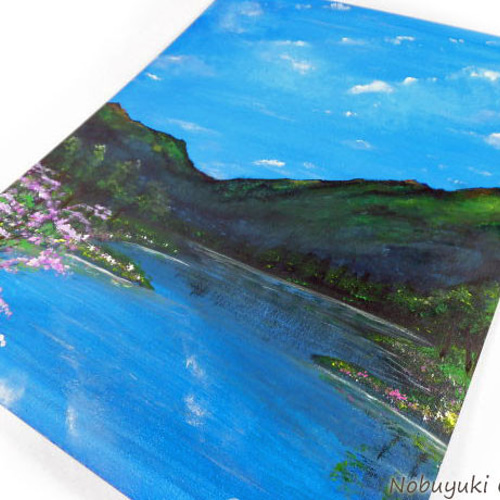 - 美術品・アンティーク・コレクション > 絵画 > 原画1点限り★オリジナル絵画「Lakeside in spring(2020)」 アクリル絵画「Lakeside in spring」原画【手描き/湖畔・桜・春・山